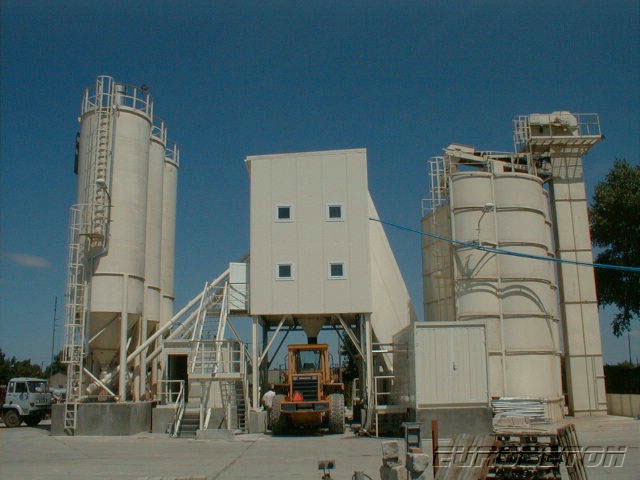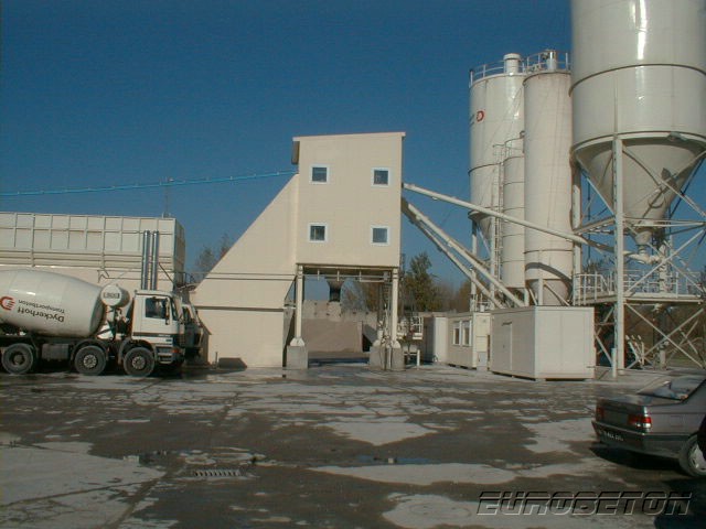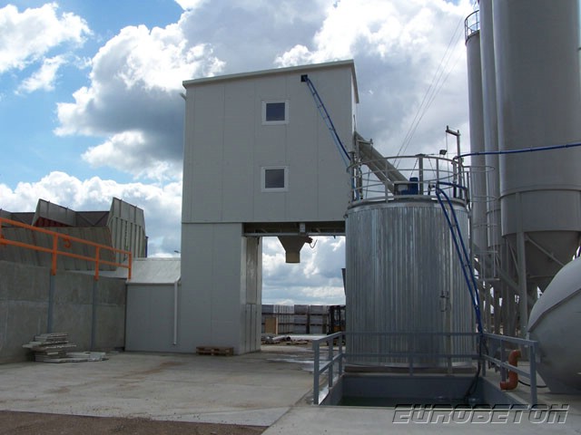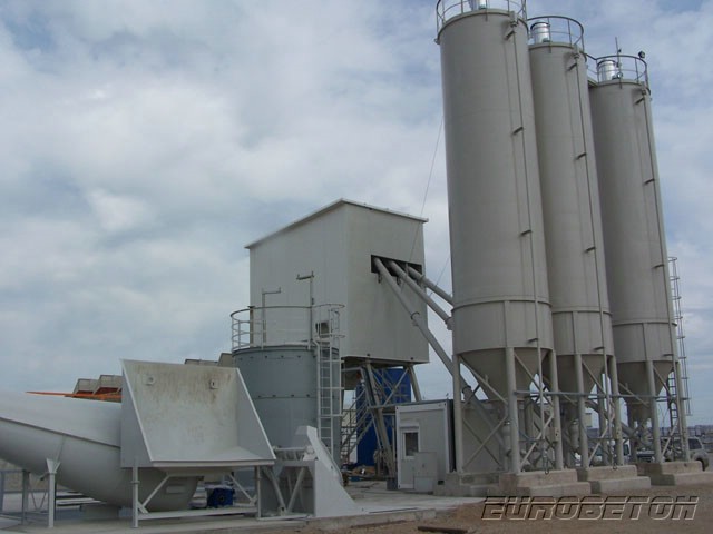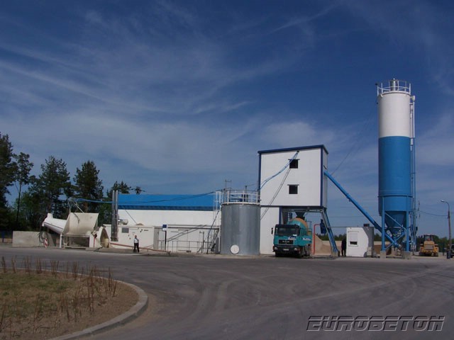 Ortsfeste Einrichtung der Betonfabrik mit dem Reihensilo, Typ „ToBetMix 35-175/5 2,0 3/100 ” mit der Leistung ca. 90 m3 /h, mit drei Zementsilos je 100 t., mit der Computersteuerung der Firma DORNER Electronik und dem Betonmischer fm BHS, Typ 2,0 m3.